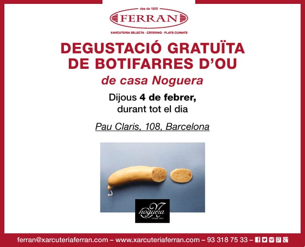 Aquest dia és tradició menjar botifarra d’ou, per això, la degustació de febrer durarà tot el dia i podrem gaudir de les millors botifarres d’ou de Casa Noguera (tradicional, amb patata i ceba, amb bacon, i més …), família apassionada pels embotits i amb 150 anys d’experiència.