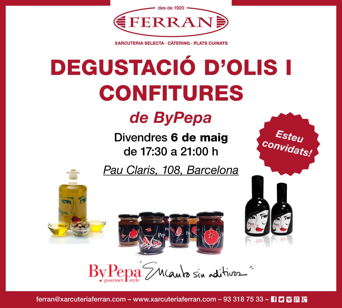 El divendres que ve dia 6 de maig us oferim un tast que estem segurs us sorprendrà i us deixarà amb la boca oberta. Prepareu-vos per degustar els olis i confitures de By Pepa, productes d’altíssima qualitat, selecció gourmet, elaborats mitjançant processos artesanals amb una selecció rigorosa de la matèria primera. Són a més productes únics i personals perquè es presenten en uns dissenys únics, atractius, especials i molt personals, igual que personal és la filosofia de By Pepa. En les seves pròpies paraules “aroma, impuls, disseny, qualitat, sabor…” Encant sense additius.