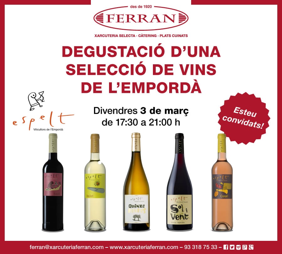 Com cada mes tenim preparada una degustació especial per a tots vosaltres. La de març serà el proper divendres dia 3 des de les 17:30h fins a les 21:00h amb els vins de www.cellerespelt.com. Serà una gran degustació perquè podreu assaborir fins a cinc vins diferents!