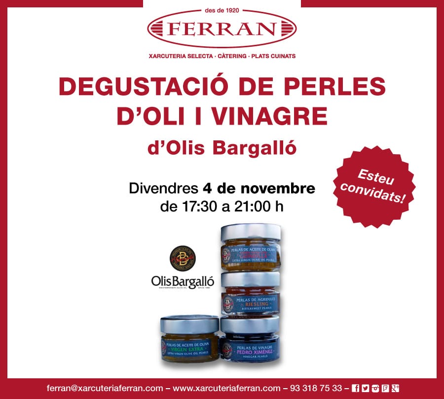 Com sempre, us volem convidar a una degustació amb els millors productes. Serà el proper dia 4 de novembre i, aquesta vegada, us volem sorprendre amb les possibilitats que donen l’oli i el vinagre. Descobrirem com, a través d’ells, podem gaudir de nous i inesperats sabors aconseguint crear plats amb un altre estil. I amb qui ho farem? Doncs amb Olis Bargalló, especialistes des de 1850, en crear els millors olis d’oliva verge extra amb les olives de millor qualitat. Grans coneixedors de tots els seus processos, des de llavors, es preocupen de portar a les taules el seu excel·lent gust. Amb la quarta generació de la família i, mantenint la qualitat que els caracteritza, Olis Bargalló ve presentant nous productes per a aquests nous temps gastronòmics on es barregen la innovació amb la saviesa dels anys d’experiència.