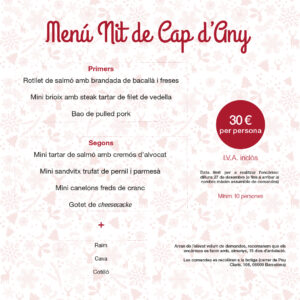 El menú de Cap d’any està compost per un rotllet de salmó amb brandada de bacallà i caviar, gotet d’escuma de foie amb melmelada de figues i ametlla caramel·litzada, mini brioix amb steak tartar de filet de vedella, bao de pulled pork, mini tartar de salmó amb cremós d’alvocat, mini sandvitx trufat de pernil i parmesà i mini canelons freds de cranc. Per a postres, gotet de cheesecake.