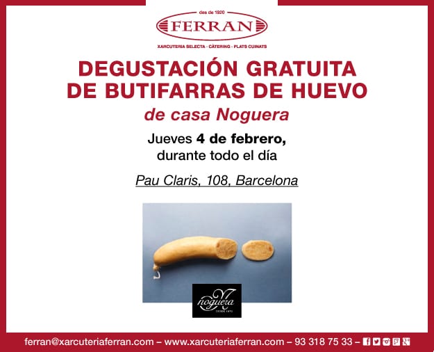 En Cataluña este día se conoce como Dijous Gras y es tradición comer butifarra de huevo, por eso, la degustación de febrero durará todo el día y podremos disfrutar de las mejores butifarras de huevo de Casa Noguera (tradicional, con patata i cebolla, con bacon, y más…), familia apasionada por los embutidos y con 150 años de experiencia.