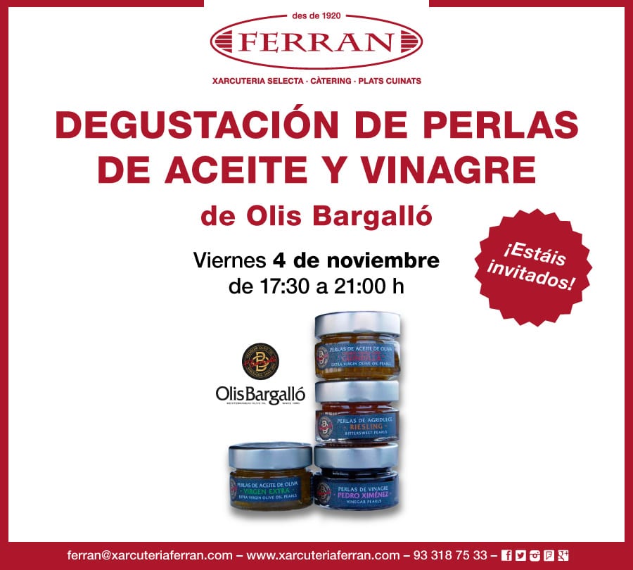 Como siempre, os queremos invitar a una degustación con los mejores productos. Será el próximo día 4 de noviembre y, esta vez, os queremos sorprender con las posibilidades que dan el aceite y el vinagre. Vamos a descubrir como, a través de ellos, podemos disfrutar de nuevos e inesperados sabores consiguiendo crear platos con otro estilo. ¿Y con quién lo vamos a hacer? Pues con Olis Bargalló, especialistas desde 1850, en crear los mejores aceites de oliva virgen extra con las aceitunas de mejor calidad. Grandes conocedores de todos sus procesos, desde entonces se preocupan de llevar a las mesas su excelente sabor. Con la cuarta generación de la familia y, manteniendo la calidad que los caracteriza, Olis Bargalló viene presentando nuevos productos para estos nuevos tiempos gastronómicos en los que se mezclan la innovación con la sabiduría de los años de experiencia.