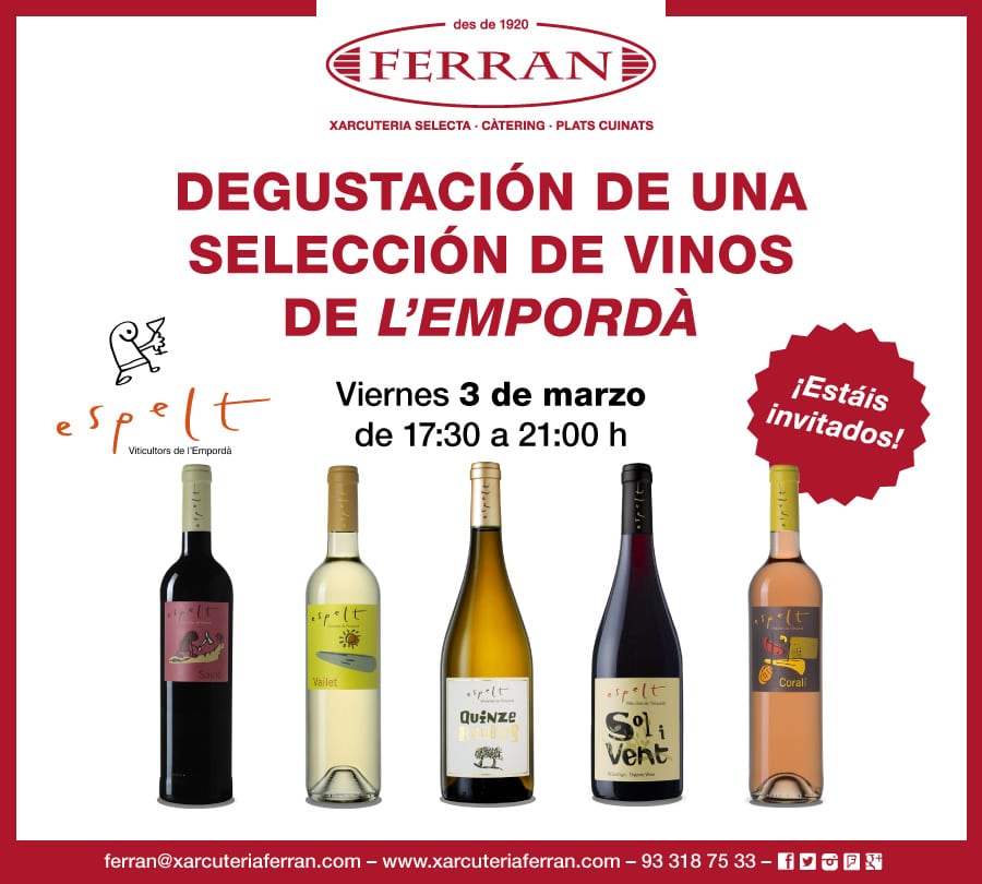 Como cada mes tenemos preparada una degustación especial para todos vosotros. La de marzo será el próximo viernes día 3 desde las 17:30h hasta las 21:00h con los vinos de www.cellerespelt.com. Va a ser una gran degustación porque vais a poder saborear ¡hasta cinco vinos distintos!