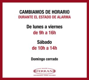 Durante el estado de alarma, nuestro horario será algo diferente. De lunes a viernes abriremos a las 9h y cerraremos a las 16h. El sábado haremos de 10h a 14h.