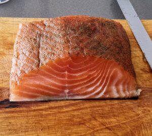 3. Ponemos una capa de la mezcla y disponemos el salmón con la piel hacia abajo, cubrimos con el resto de la mezcla, lo tapamos con film y lo dejamos en nevera durante 2 o 3 días dependiendo del grosor del salmón. Las marinadas de especies aceptan muchas posibilidades y se pueden variar al gusto de cada uno.