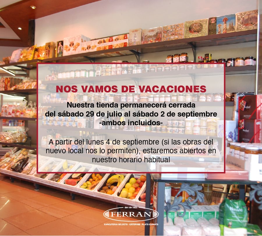 ¡Llegan las vacaciones a Xarcuteria Ferran! Este año hemos trabajado muy duro preparando vuestros platos y recetas favoritas. Por ello, ha llegado la hora de tomarnos un descanso para así, volver a tope con las pilas cargadas. Eso sí, tenemos preparada una gran sorpresa para cuando volvamos de vacaciones… ¡La inauguración de nuestra nueva tienda!
