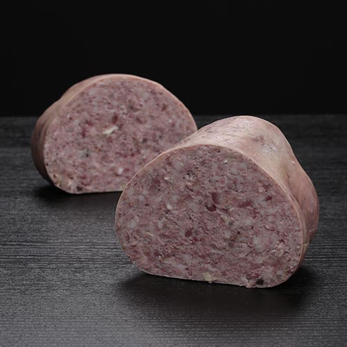 Bull blanco con nueces y trufa «Casa Noguera». Elaborado con el tocino, magro y papada de cerdo, pero también el morro, el vientre, la lengua, etc., aprovechando las mejores y sabrosas partes del cerdo. Se le añaden nueces y trufa negra como topping, dándole así una profundidad de aroma con la trufa y una textura crujiente con la nuez, y se añade la sal, pimienta y especias.