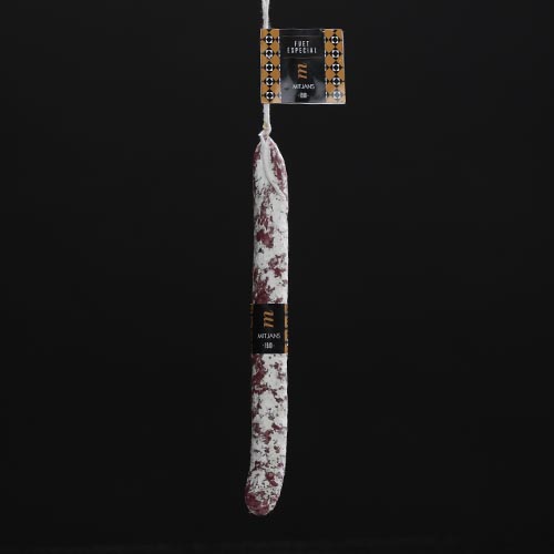 Fuet elaborado con una selección de las carnes más nobles del cerdo (jamones, lomos, tocino) para conseguir un producto magro y saludable. Aderezado según la fórmula de la familia y sometido a un proceso de curación tranquilo con la aparición de la flora natural.
