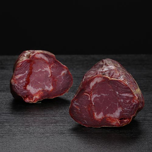 Morcón 100% ibérico de bellota, elaborado con carnes seleccionadas de toma, filete y lomo con baja cantidad de grasa y condimentado con especias. Al utilizar carne tan delicada, su proceso natural de curación es más lento, oscilando entre 4 y 6 meses.